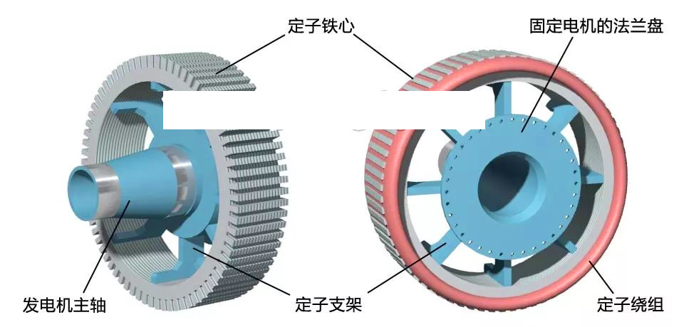 定子鐵心安裝在定子支架上,定子支架一端有安裝到機艙機座的法蘭,另一端是外轉子轉軸,也是風力發(fā)電機的主軸,主軸要負擔整個風輪與外轉子的重量與風力,主軸與法蘭盤要有很高的強度
