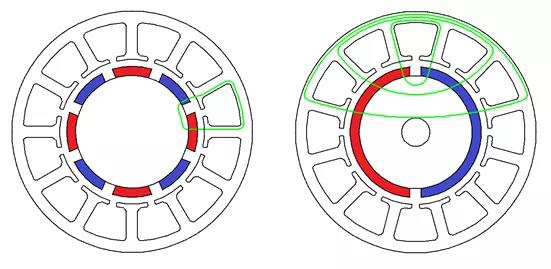 首先要知道電機(jī)的槽極配關(guān)系,也就是一極會(huì)對(duì)應(yīng)到幾齒數(shù)量,來(lái)決定軛部與齒部的關(guān)系式。以下圖為例,則左方定子軛部會(huì)流經(jīng)的磁通與單一齒部的一致,則小軛部需求寬度與齒部同寬即可;右方例子中,軛部密集處會(huì)流經(jīng)三個(gè)齒部的磁通,因此軛部小寬度應(yīng)為齒部寬度的三倍,方為合理的關(guān)系。