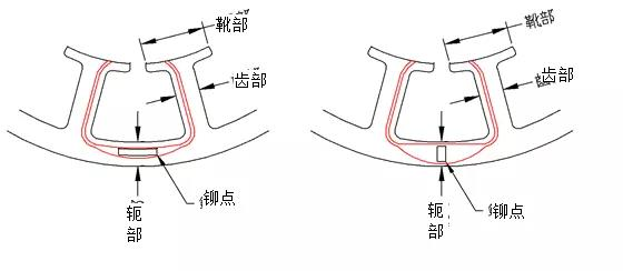 軛部:設(shè)計(jì)有三項(xiàng)需注意,分別為磁通密度、機(jī)械強(qiáng)度及鉚合點(diǎn)問(wèn)題,先由簡(jiǎn)單的鉚點(diǎn)設(shè)計(jì)來(lái)說(shuō),基本上要先考量矽鋼片堆疊后的重量來(lái)決定鉚點(diǎn)數(shù)量,過(guò)多的鉚點(diǎn)數(shù)會(huì)影響磁力通過(guò)及機(jī)械強(qiáng)度問(wèn)題,合理的鉚合強(qiáng)度,鉚點(diǎn)數(shù)越少越好。下圖表示鉚點(diǎn)的方向好與磁通方向一致,降低對(duì)磁通影響程度。
