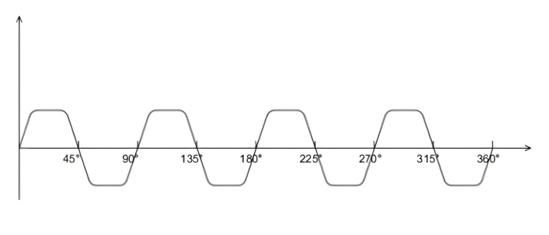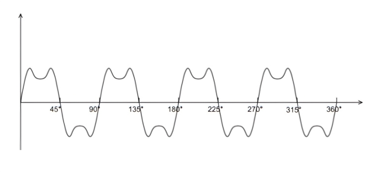 特征:磁密在相鄰磁極之間呈現(xiàn)近似“開關(guān)式”變化,從正峰值到負(fù)峰值的轉(zhuǎn)換非常迅速,上升沿和下降沿陡直,幾乎沒有過渡區(qū),在磁極中心區(qū)域,磁密接近恒定并快速達(dá)到飽和值,磁極邊界清晰、極性分界明確。