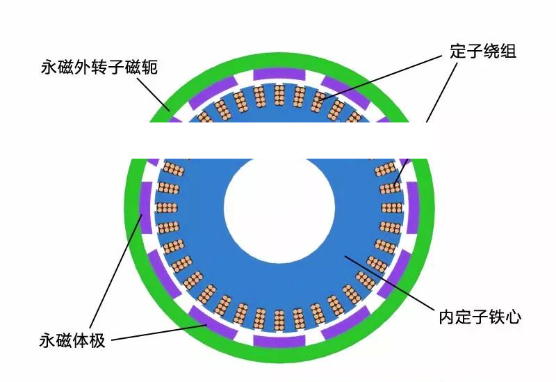 2、永磁體積大小。外轉子永磁體積小,軸向尺寸小,系統(tǒng)運行穩(wěn)定性好。內(nèi)轉子永磁體積大,軸向尺寸對應也就更大,重心高,運行穩(wěn)定性差。