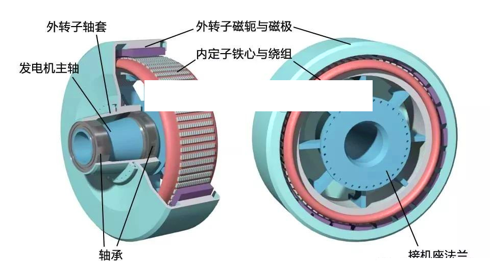 把外轉子安裝在發(fā)電機主軸上,組成外轉子發(fā)電機,下圖從兩個方向展示其結構。外轉子軸套既固定外轉子,還要安裝整個風輪,承受很大的負荷,所以通過兩個大軸承安裝在發(fā)電機主軸上。